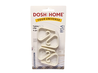 Клипсы для скатерти, или зажимы для скатерти, используют на открытом пространстве чтобы закрепить скатерть к столу, чтобы она не улетала и не задиралась от ветра. Фиксируются по четырём сторонам стола. Так же подходят для круглых столешниц. Благодаря белому цвету, практически не видны на белых скатертях в ресторанах, в уличных кафе, на террассных столах в отелях. Подходят для всех типов столешниц, толщиной до 14 мм (1,4 см). Комплект 4 штуки.